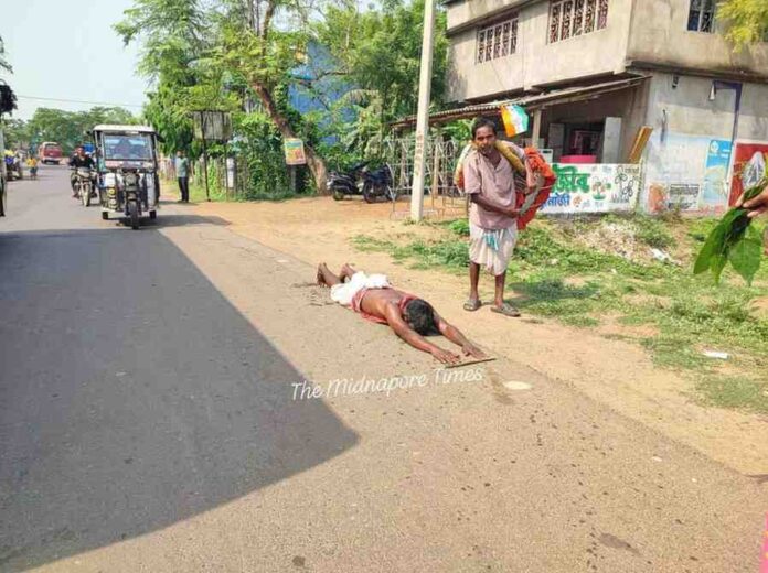 মানত পূর্ণ হওয়ায় এবার ঈশ্বরকে ধন্যবাদ জানাতে এক কঠিন সংকল্প নিলেন কৃপাসিন্ধু। রসিক নগরের নিজের বাড়ি থেকে টানা ৪ কিলোমিটার রাস্তা বুক ঘষে দণ্ডি কাটতে কাটতে তিনি এগিয়ে চললেন ওই শিব মন্দিরের দিকে। রোদে পুড়ে, ধুলো মেখে এই কষ্টকর যাত্রায় তাঁকে সাহস জোগাতে সাথে রয়েছেন তাঁর স্ত্রী, দুই মেয়ে এবং এক প্রতিবেশী।