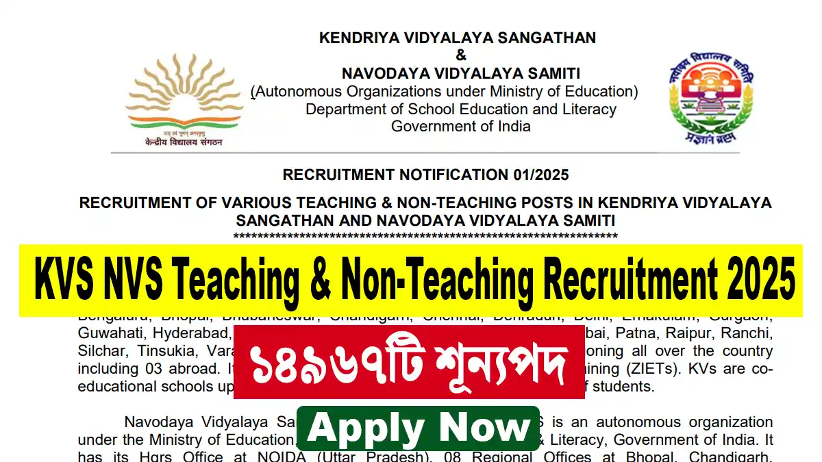 KVS & NVS Recruitment 2025: কেন্দ্রীয় বিদ্যালয় সংগঠন (KVS) এবং নবোদয় বিদ্যালয় সমিতি (NVS)-এ শুরু হয়েছে বছরের সবচেয়ে বড় নিয়োগ প্রক্রিয়া। শিক্ষক ও নন-টিচিং — মিলিয়ে মোট 14,967টি শূন্যপদে নিয়োগের বিজ্ঞপ্তি প্রকাশিত হয়েছে। ১৪ নভেম্বর থেকে শুরু হয়েছে অনলাইন আবেদন। শেষ তারিখ ৪ ডিসেম্বর ২০২৫।