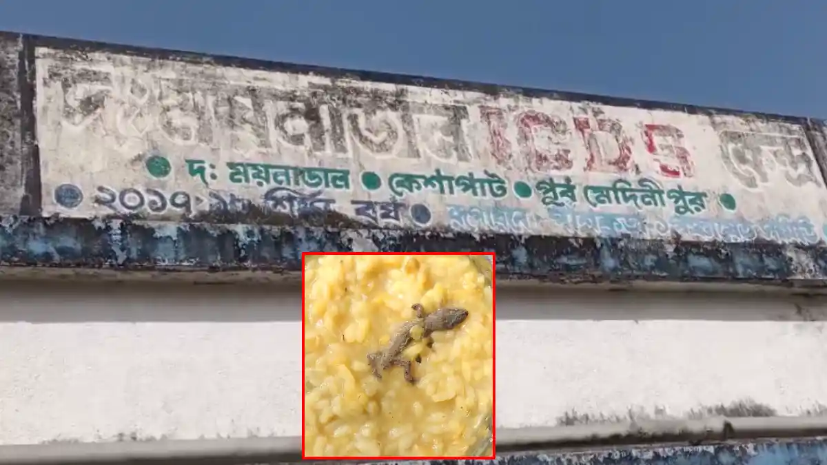 ঘটনাটি ঘটেছে পাঁশকুড়ার ময়নাডাল এলাকার একটি আইসিডিএস কেন্দ্রে। স্থানীয় সূত্রে জানা যায়, নির্ধারিত সময়ে শিশুদের খিচুড়ি খাওয়ানো হয়। খাবার খাওয়ার কিছুক্ষণের মধ্যেই একাধিক শিশু বমি, পেটব্যথা ও অস্বস্তিতে ভুগতে শুরু করে। পরে খিচুড়ির হাঁড়ি পরীক্ষা করতেই সেখানে একটি মরা টিকটিকি দেখতে পান অভিভাবকরা।