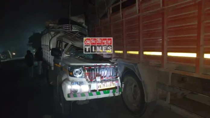 স্থানীয় সূত্রে জানা গিয়েছে, তেমাথানি–পটাশপুর রাজ্য সড়ক ধরে দশগ্রামের দিকে সবজি নিয়ে যাচ্ছিল পিকআপ ভ্যানটি। ভোরের দিকে চাঁদকুড়ি বাজার এলাকায় পৌঁছতেই সামনে দাঁড়িয়ে থাকা পটাশপুরমুখী লরিটিকে দেখতে না পেয়ে আচমকাই নিয়ন্ত্রণ হারায় পিকআপটি। মুহূর্তের মধ্যে সজোরে ধাক্কা লাগে লরির পিছনে। বিকট শব্দে কেঁপে ওঠে আশপাশের এলাকা। দুমড়ে-মুচড়ে যায় পিকআপের সামনের অংশ।