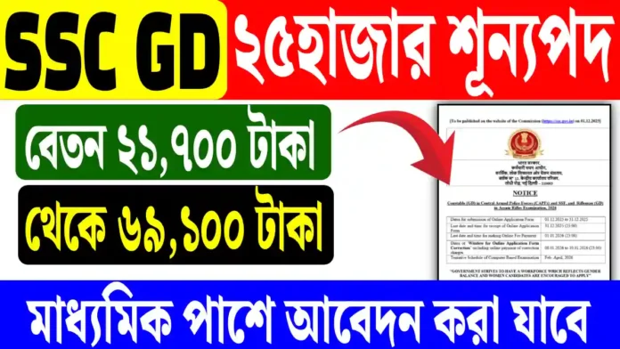 সমস্ত চাকরিপ্রার্থীদের জন্য দারুণ খুশির খবর। অবশেষে প্রকাশ করা হয়েছে SSC GD Constable Notification 2025-2026, যেখানে মোট ২৫৪৮৭টি শূন্যপদে নিয়োগ করা হবে। কেন্দ্রের বিভিন্ন নিরাপত্তা বাহিনীতে চাকরির স্বপ্ন দেখছেন এমন প্রার্থীদের জন্য এটি একটি সুবর্ণ সুযোগ। আবেদন প্রক্রিয়া শুরু হয়েছে ১ ডিসেম্বর ২০২৫ এবং চলবে ৩১ ডিসেম্বর ২০২৫ পর্যন্ত। Pay Level – 3 (₹21,700 – ₹69,100) ছেলে-মেয়েরা উভয়ই অনলাইনে আবেদন করতে পারবে। তাই আজকের রিপোর্টে জানিয়ে দিচ্ছি — গুরুত্বপূর্ণ তারিখ, ভ্যাকান্সি, যোগ্যতা, বয়সসীমা, আবেদন পদ্ধতি এবং সিলেকশন প্রসেসের সম্পূর্ণ তথ্য।