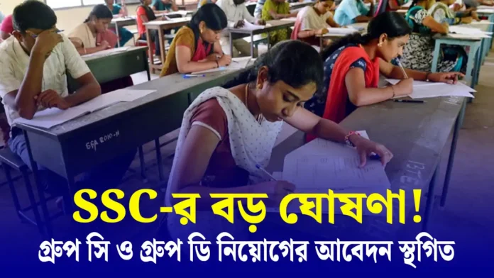 SSC Recruitment 2025: চাকরিপ্রার্থীদের জন্য বড় ধাক্কা! পশ্চিমবঙ্গ স্কুল সার্ভিস কমিশনের (SSC) প্রকাশিত বিজ্ঞপ্তি অনুযায়ী, SSC Recruitment 2025 গ্রুপ সি ও গ্রুপ ডি পদের আবেদন প্রক্রিয়া আপাতত স্থগিত রাখা হয়েছে। ঠিক আবেদন শুরুর আগেই কমিশনের এই সিদ্ধান্তে প্রায় ৮,৭০০ শূন্যপদের প্রস্তুতি নেওয়া লক্ষ লক্ষ প্রার্থী চরম অনিশ্চয়তায় মধ্যে পড়েছেন।