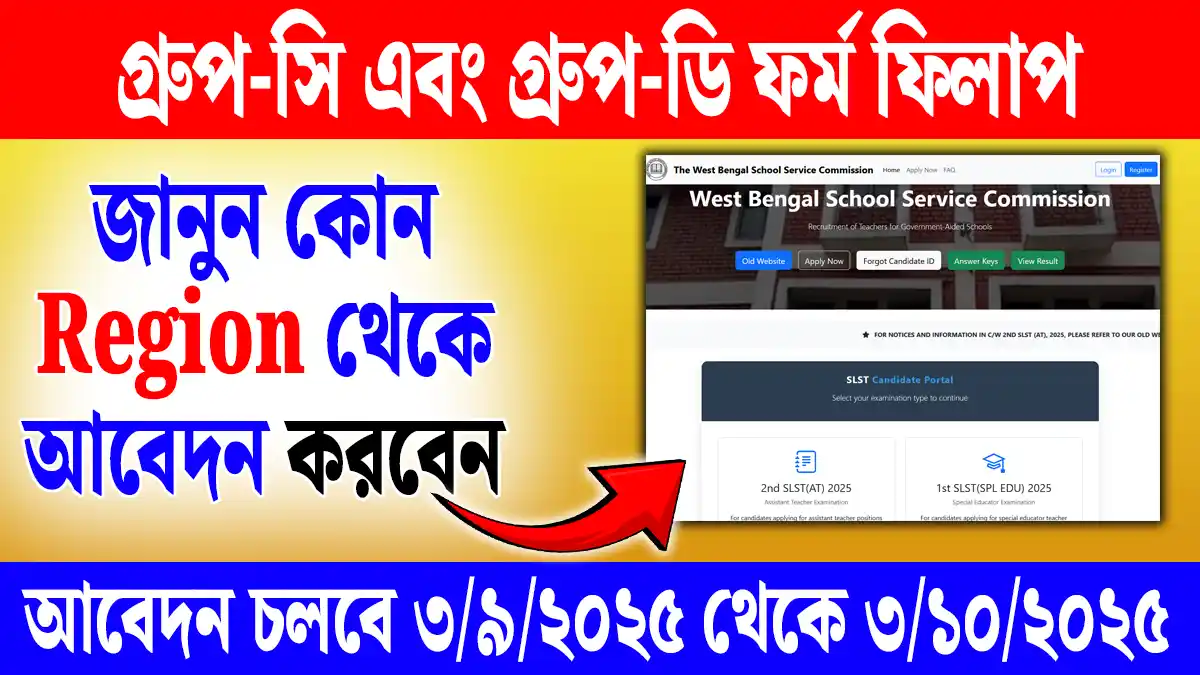 WB Group C & D Form Fill Up 2025: পশ্চিমবঙ্গ স্কুল সার্ভিস কমিশন (WBSSC) এর তরফে প্রকাশিত হয়েছে Group C (Clerk) এবং Group D পদের জন্য নতুন নিয়োগ বিজ্ঞপ্তি। আবেদন প্রক্রিয়া শুরু হয়েছে ৩ নভেম্বর ২০২৫ থেকে এবং চলবে ৩ ডিসেম্বর ২০২৫ পর্যন্ত। এই নিয়োগ প্রক্রিয়ায় আবেদনকারীদের Region Wise ফর্ম ফিলাপ করতে হবে। অনেকেই কোন জেলার জন্য কোন Region তা নিয়ে বিভ্রান্ত, তাই এখানে আমরা পুরো Region অনুযায়ী জেলা তালিকা এবং Vacancy Details সহ সব কিছু বিস্তারিতভাবে জানাচ্ছি।