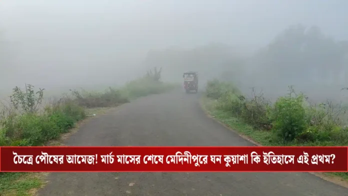 Weather news: মাঝ চৈত্রে যেখানে থাকার কথা তীব্র গরম আর খরতাপ, সেখানে উল্টে মেদিনীপুরে দেখা গেল শীতের সকালের মতো ঘন কুয়াশা। মার্চ মাসের শেষ দিকে এমন দৃশ্য কার্যত অবাক করেছে সাধারণ মানুষ থেকে বিশেষজ্ঞ—সকলকেই। সকালবেলা রাস্তায় বেরিয়ে অনেকেই যেন ফিরে গিয়েছিলেন পৌষ মাসের আবহে।